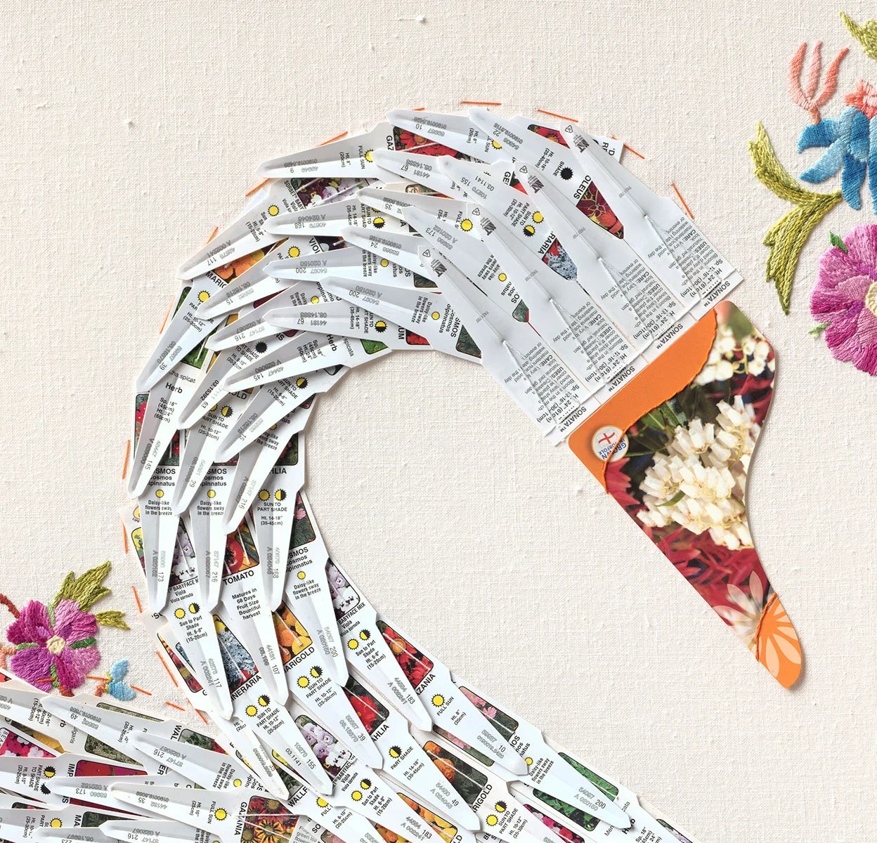 556 plant labels have been substituted for the 25000 feathers usually produced by a single bird, and arranged in the image of a Swan. The background is a vintage linen tablecloth, previously handcrafted with intricate stitch for use as a table decoration, but used here to provide a canvas for the portrait. Used plant labels, still marked with traces of soil have been attached with needle and thread to represent feathers. They capture the elegant S-shape curvature of the Swans elongated neck and graceful posture.