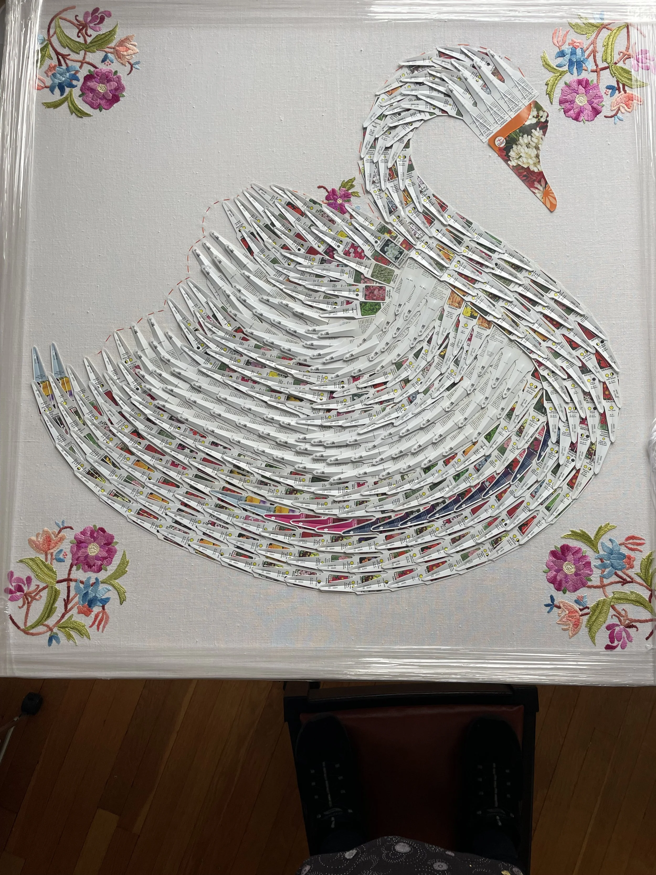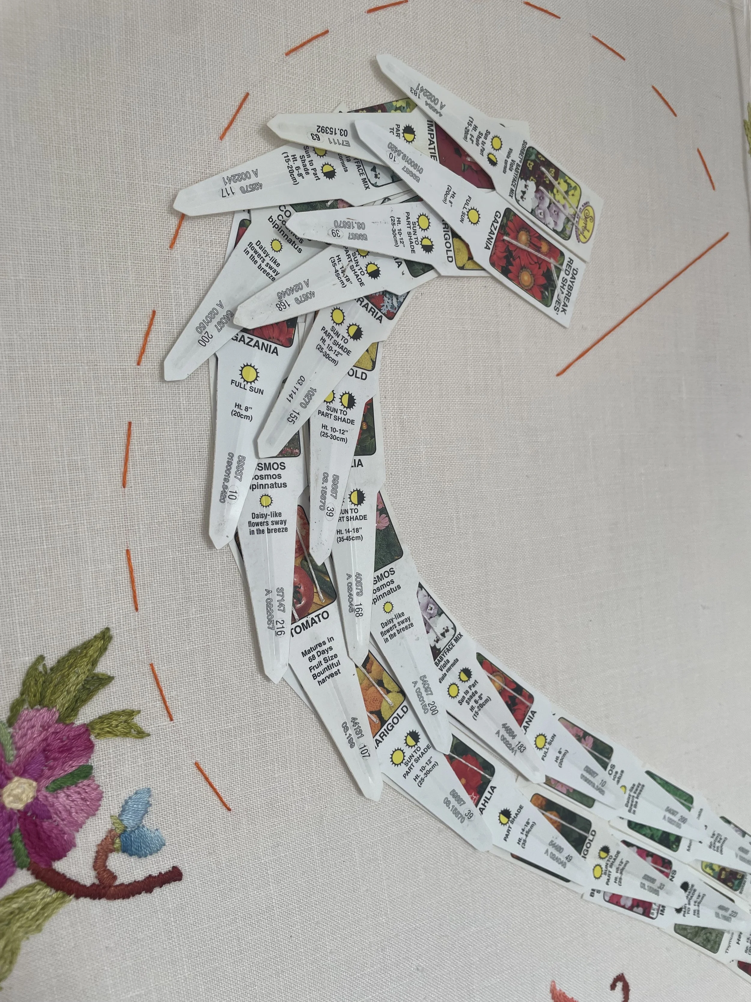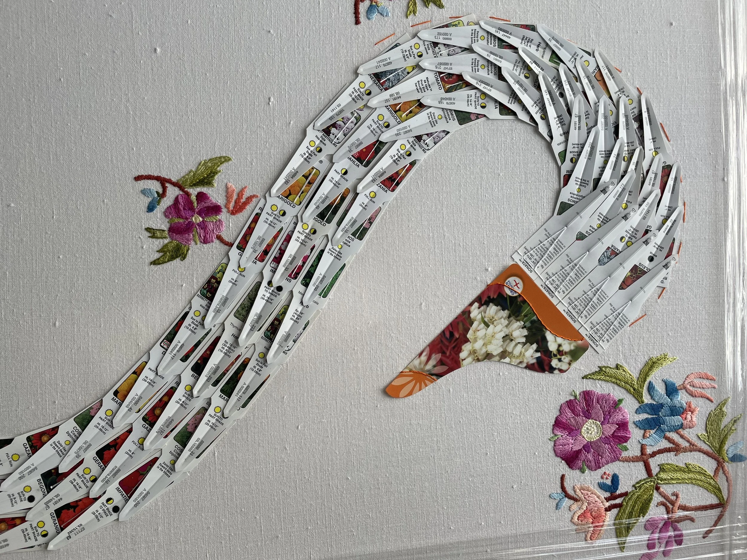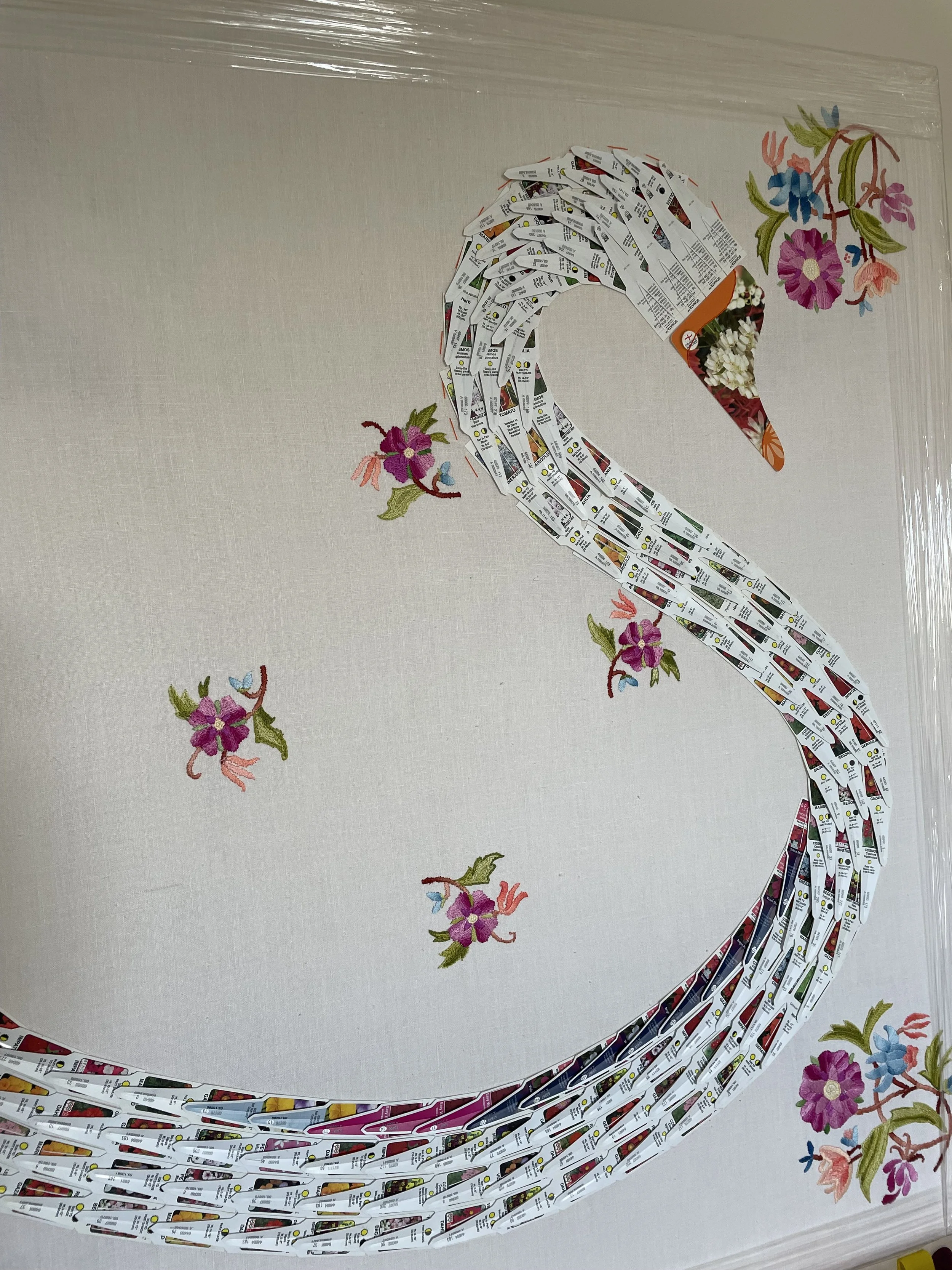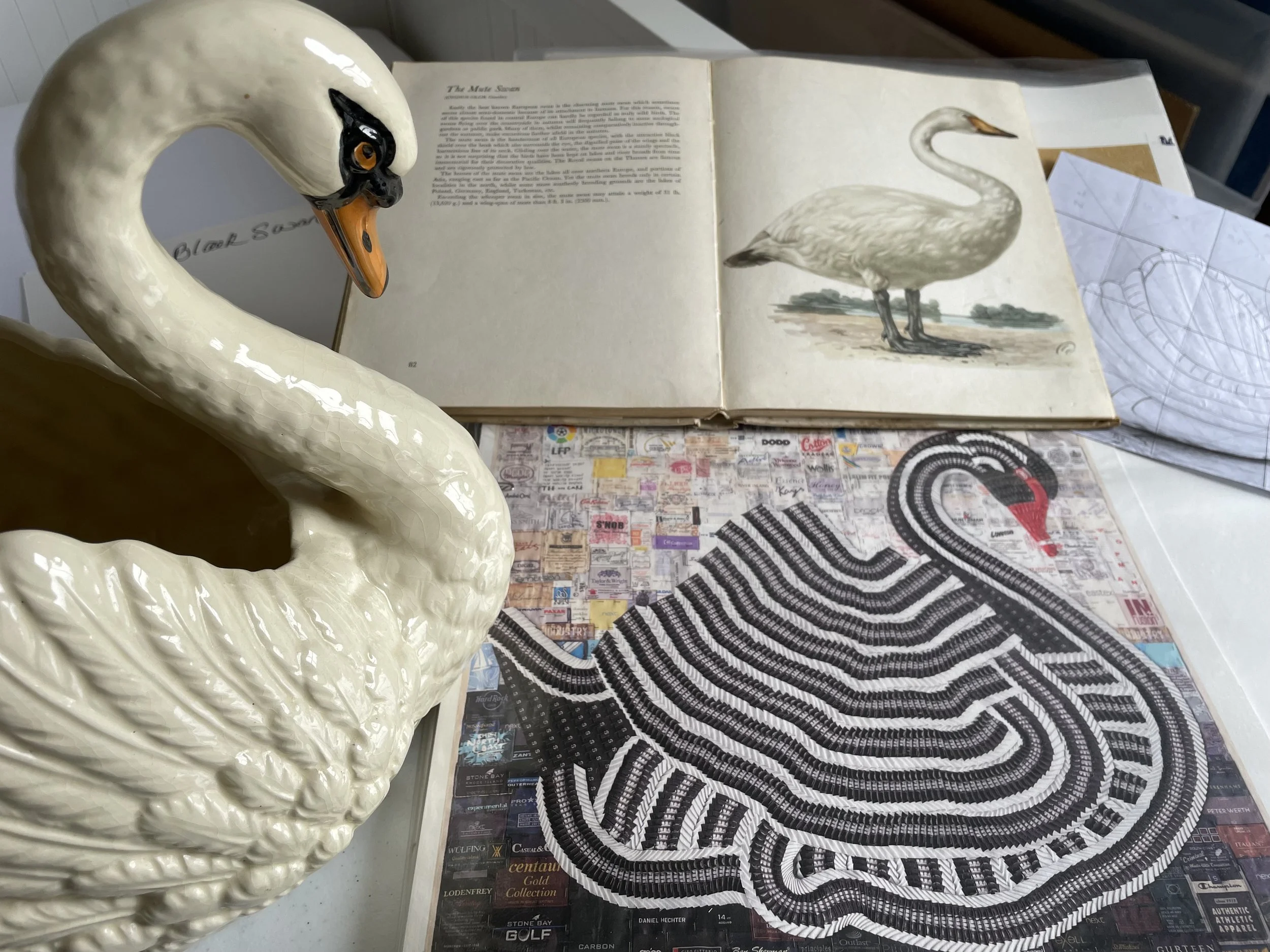 An experiment to explore 100s of used plant labels assembled in the image of a majestic swan, a subject for some reason that I keep returning to.